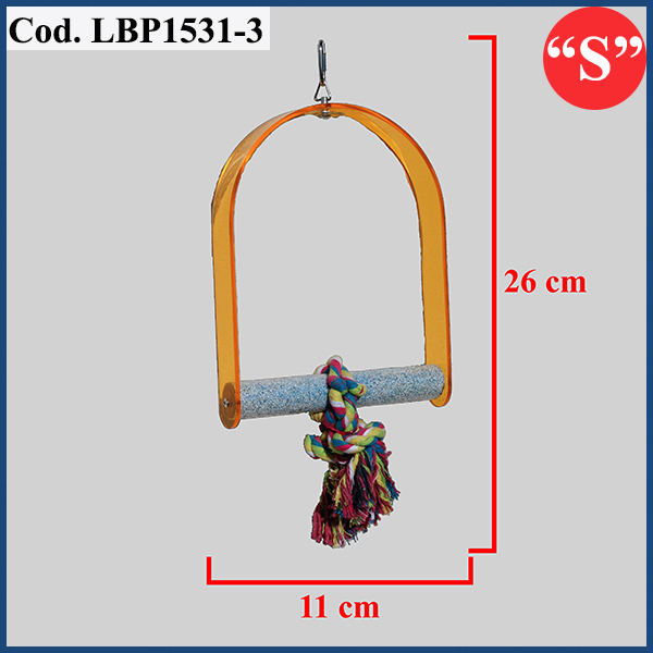 Altalena in plastica, composta da posatoio lima unghie e gioco in corde. Dotata di gancio per poterla appendere all'interno di qualsiasi gabbia. Disponibile in vari colori. DIMENSIONI H 26 x L 11 cm – Ø 1,7 cm